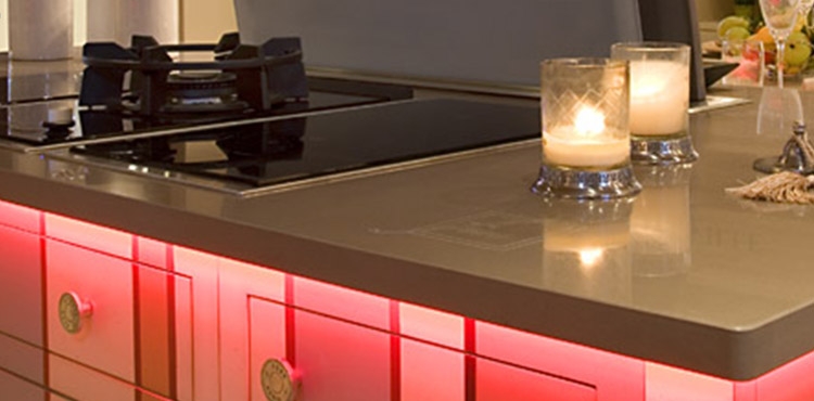 The ultimate in elegance; a work surface of composite quartz sparkling under a strip of LED lights.