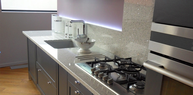 Raffinement d’un revêtement composite quartz pailleté surligné par une rampe de Leds. Elégance sans concession.